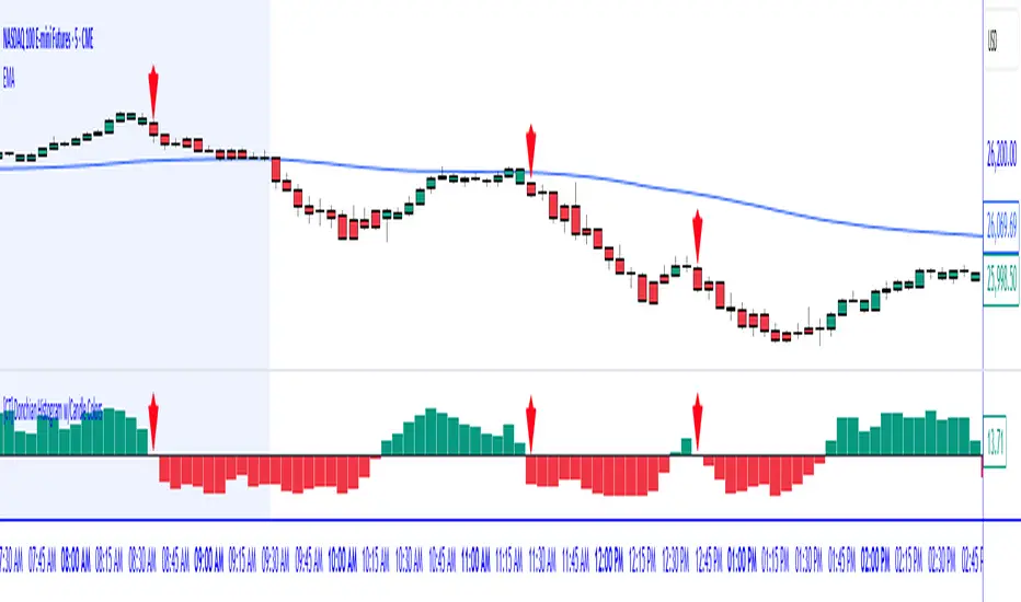 Donchian Histogram, originally created by RafaelZioni and enhanced with optional price bar coloring, is a momentum-style oscillator that shows where the current close sits inside a dynamic Donchian channel and how that position is evolving over time. The script calculates a rolling high and low over a multi-session lookback period based on your chosen Donchian timeframe, then normalizes the close within that range to create a percentage position between the recent high and low. This normalized value is smoothed with a signal length and plotted as a histogram around a zero line, making it easy to see whether price is pressing toward the upper side of its recent range, the lower side, or oscillating near the middle. Positive values indicate that price is trading closer to the Donchian high, negative values indicate price is closer to the Donchian low, and the magnitude of the histogram reflects how strongly price is favoring one side of the range. The color logic highlights this state visually: stronger positive conditions can be shown in teal, moderate positive conditions in lime, stronger negative conditions in red, and neutral or transitional states in orange. The script also includes an option to color the actual chart candles with the same colors as the histogram, so traders can see Donchian-based pressure directly on the main price chart without constantly looking down at the lower pane. The indicator works on completed bars using standard highest/lowest and moving average functions, so it behaves like a normal oscillator and does not use any lookahead tricks. It is best used as a contextual tool to gauge whether price is pushing to the edges of its recent range or reverting toward balance, and to visually synchronize that information with candle colors when desired.
