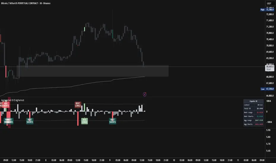 - Liquidation cascade detection — highlights when 2+ consecutive bars show large OI decrease (margin