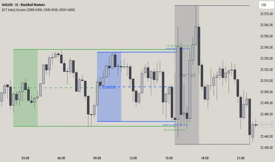 This indicator visualizes the Asia, London and New York trading sessions and tracks each session’s high, low and midpoint in real time. It highlights key session phases and monitors how price interacts with prior session liquidity levels across subsequent sessions.
