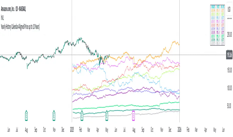 This indicator helps traders compare historical price patterns from the past 10 calendar years with the current price action. It overlays translucent lines (polylines) for each year’s price data on the same calendar dates, providing a visual reference for recurring trends. A dynamic table at the top of the chart summarizes the active years, their price sources, and history retention settings.