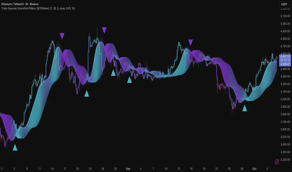 The Triple Gaussian Smoothed Ribbon provides a layered, intuitive read on market structure: