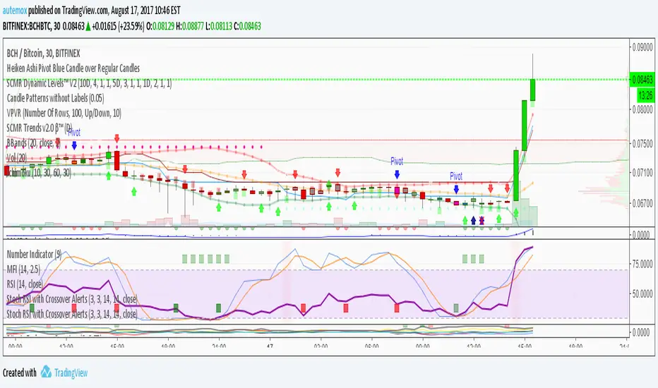 This draws your Stochastic RSI just like normal except it adds red or green squares everytime there is a crossover at the bottom or the top of the oscillator. Green crossover is bullish, red is bearish.
