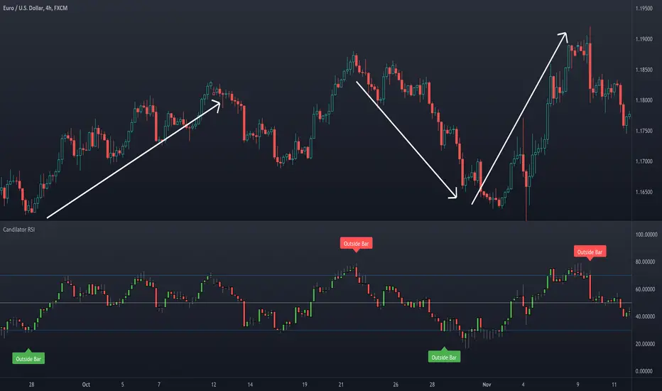 The name Candilator comes from blending the words "candlestick" and "oscillator". And as the name suggests, this indicator is a good old RSI plotted as a candlestick chart. To produce a candlestick chart, Candilator RSI calculates four RSI's based on the open, high, low, and close time series. It also has a candlestick patterns detection feature.