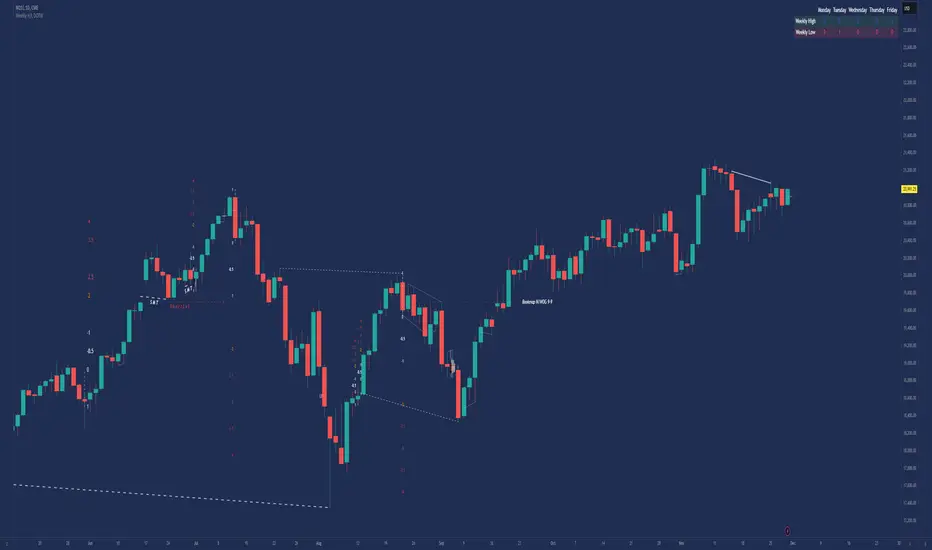 The Weekly High/Low Day Breakdown indicator provides a detailed statistical analysis of the days of the week (Monday to Sunday) on which weekly highs and lows occur for a given timeframe. It helps traders identify recurring patterns, correlations, and tendencies in price behavior across different days of the week. This can assist in planning trading strategies by leveraging day-specific patterns.