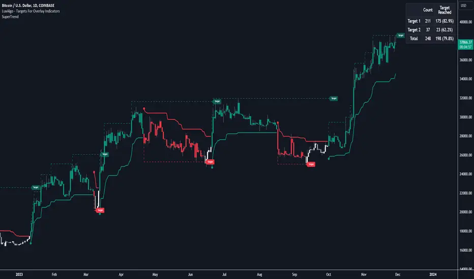 Targets can help users determine the price limit where the price might start deviating from an indication given by one or multiple indicators. In the context of trading, targets can help secure profits/reduce losses of a trade, as such this tool can be useful to evaluate/determine user take profits/stop losses.