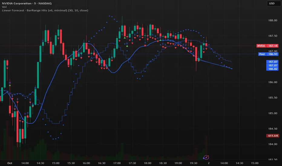 LinReg fit (history): solid line showing the best-fit linear trend over the last len bars.