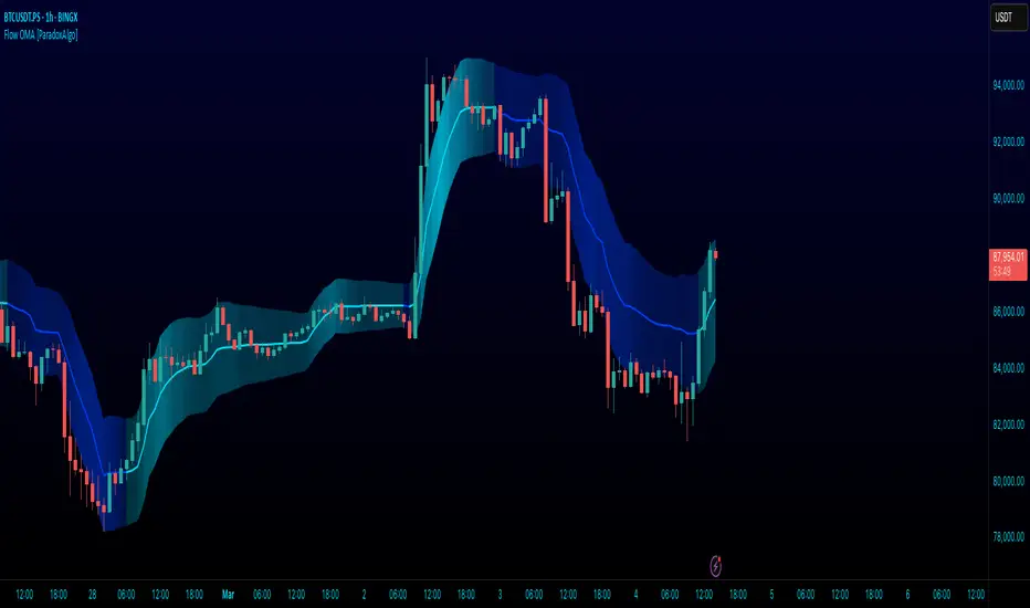 The Flow Optimized Moving Average (Flow OMA) [ParadoxAlgo] is an advanced adaptive moving average designed to dynamically adjust smoothing factors based on market efficiency and volatility. By integrating the Efficiency Ratio (ER) with an Adaptive Moving Average (AMA) and leveraging ATR-based bands, this indicator provides traders with a refined tool for identifying trend direction, strength, and potential reversal zones.