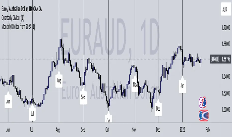 This Trading View indicator visually marks the beginning of each month starting from January 2024. It draws vertical lines on the chart at the start of each month and labels them with the corresponding month abbreviation (e.g., "Jan", "Feb"). Users can customize the color and thickness of the lines through the indicator settings, allowing for personalized chart aesthetics. This tool is ideal for traders and analysts who want to easily identify month transitions and enhance their technical analysis.Release Notes