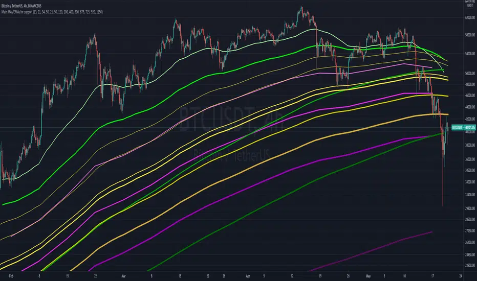 Objective is to map out different multi-timeframe support/resistance , all at once. Includes weekly, daily and 4H EMAs and MAs, as per the follow (allowing customization)