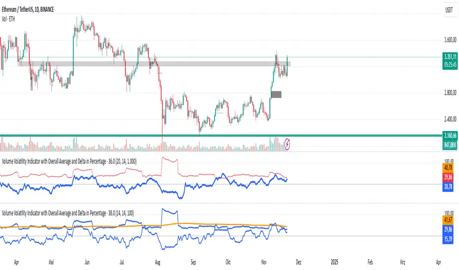 Long-Term Volatility Average (Orange Line): This line shows the moving average of the volume volatility indicator over a longer period. It acts as a benchmark for comparing the current volume volatility with historical trends.