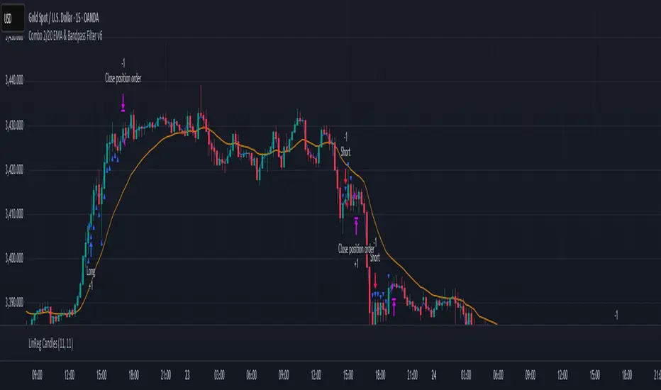 This strategy combines a 2/20 exponential moving average (EMA) crossover with a custom bandpass filter to generate buy and sell signals.