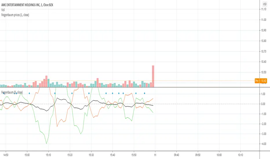This is a part of my Feigenbaum family of scripts. This one however uses the Feigenbaum Alpha constant (the constant of the width of the tein from the subteins) as a proportion of the ROC. Then it uses that to establish a middle point, and 2 resistance and 2 support lines.With the widest lines being R2 and S2. Dark red is R2 and Dark Green is S2. I encourage you to change the time frame to find what is best, I have it set at the minimum of 1.