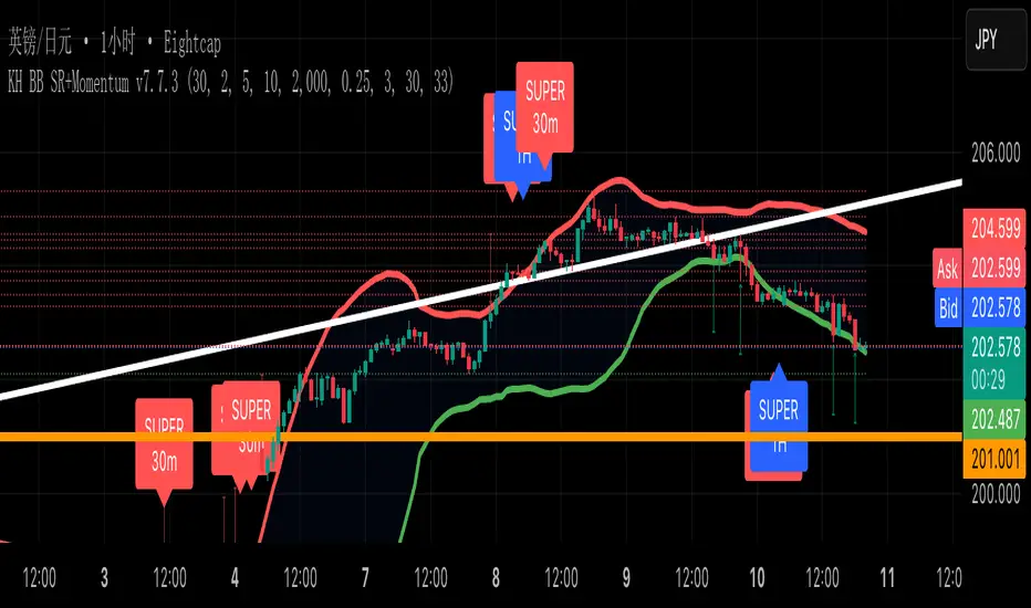 “SUPER”标签:当任一更高周期的动能进入“堆积”状态,同时当前图表价格触及布林带边缘时,图表上会出现一个醒目的“SUPER”标签,并明确标示出是哪个周期(如 SUPER 1H)。