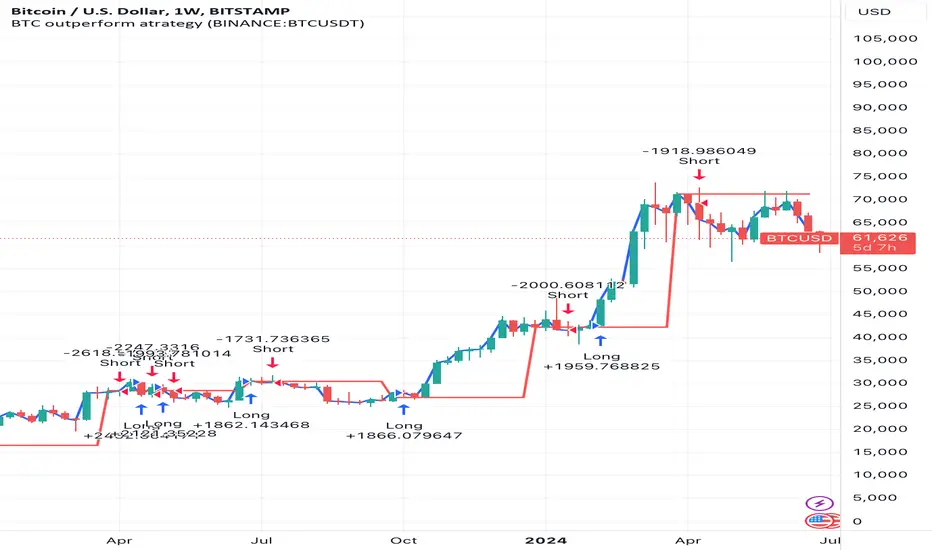 This Pine Script™ code implements a simple trading strategy based on the relative prices of Bitcoin (BTC) on a weekly and a three-month basis. The script plots the weekly and three-month closing prices of Bitcoin on the chart and generates trading signals based on the comparison of these prices. The code can also be applied to Ethereum (ETH) with similar effectiveness.