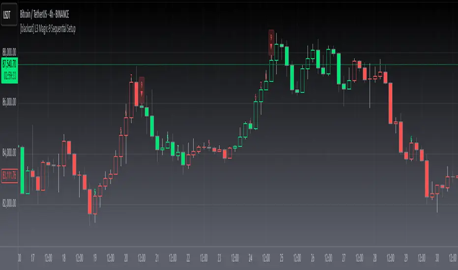 The [blackcat] L3 Magic-9 Sequential Setup indicator is designed to identify potential reversal points in the market using a sequential pattern analysis. This script plots specific labels on the chart based on predefined conditions, helping traders spot key levels where price reversals might occur 📉↗️.