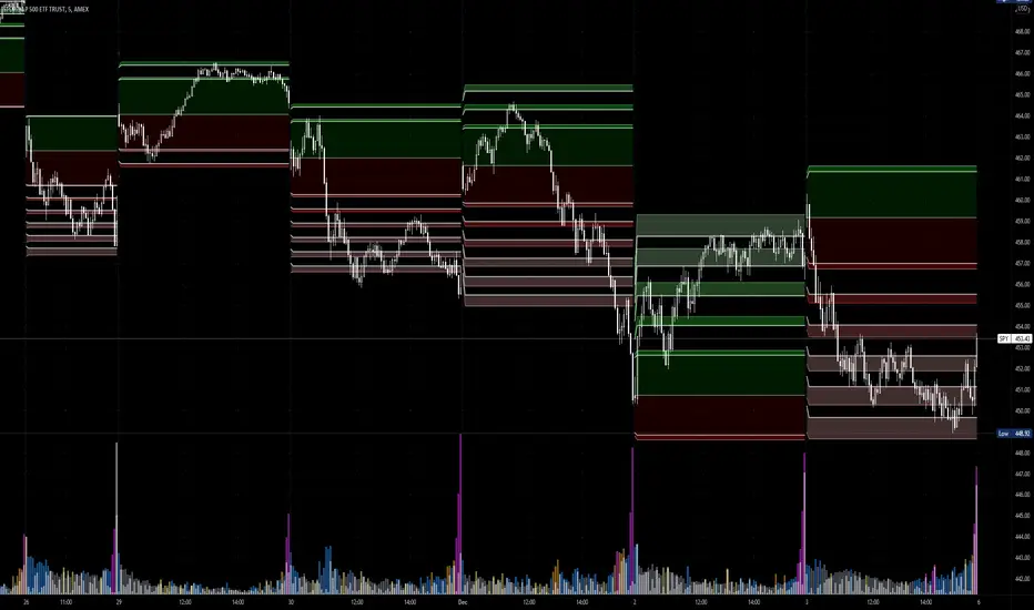 The Average Daily Range is a simple concept, calculated as the difference between daily highs and lows averaged over some period. This range is is overlaid and centered on the day's open, and tends to act as areas of support and resistance . This indicator provides two aggregation periods, creating a range that represents volatility in the ADR; a wider spread indicates greater recent volatility , and vice-versa.