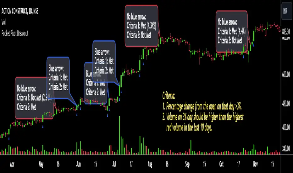 The pocket pivot breakout indicator will show a blue arrow under the candle if both the following conditions are met: