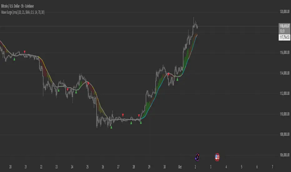 Wave Surge is indicator that visualizes market waves through dynamic price oscillations around a moving average baseline. It combines wave analysis with RSI filtering to identify trend strength and potential reversals.