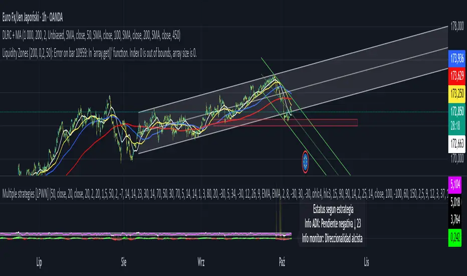 The DLRC + MA indicator is an advanced technical analysis tool that combines double linear regression channels with a moving average ribbon (MA Ribbon). Designed for traders who want to simultaneously track trend, volatility, and potential support/resistance levels.