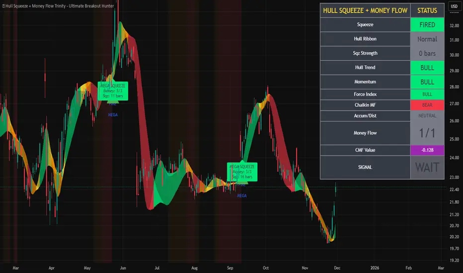 🚀 Hull Squeeze + Money Flow Trinity - Ultimate Breakout HunterThis is a high-octane, multi-factor breakout hunter designed to capture explosive moves by identifying the rare confluence of extreme price compression, aligned trend, and confirmation from institutional money flow. It combines three best-in-class market analysis tools into a single, comprehensive signaling system.The indicator is engineered to filter out noisy, low-probability setups, focusing instead on high-conviction events like "MEGA SQUEEZE FIRE" and the elusive "GOD MODE SETUP".How the Trinity Works:📊 Hull Ribbon & Compression: Uses a ribbon of Hull Moving Averages (HMAs) to filter the underlying trend and, crucially, measure the compression of volatility relative to ATR. When the ribbon is highly compressed, it signals the market is coiled and ready for a major move—a Pre-Squeeze warning.💥 Squeeze Detection: Implements the classic Bollinger Band (BB) / Keltner Channel (KC) Squeeze logic to pinpoint the exact moment volatility is drained (Squeeze ON) and the moment the resulting energy is released (Squeeze FIRE).💰 Money Flow Trinity: Confirms the quality of the move by aggregating three volume-based indicators—Force Index, Chaikin Money Flow (CMF), and Accumulation/Distribution (A/D) Line. This generates a Money Flow Score ($\le 3$) that validates the directional pressure, ensuring the breakout is backed by genuine buying or selling.The Ultimate Edge:The indicator plots actionable signals directly on the chart and provides a real-time Dashboard displaying the status of each component and the final Signal Status. Use it to spot low-risk, high-reward opportunities on your favorite instruments.