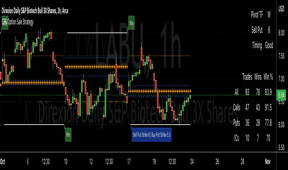 Using that comparison, this script calculates an option to sell: put, call, or iron condor. It will calculate a call value using an average of the CPR central pivot and the max value of the prior higher timeframe's high or R1 (whichever is higher.)