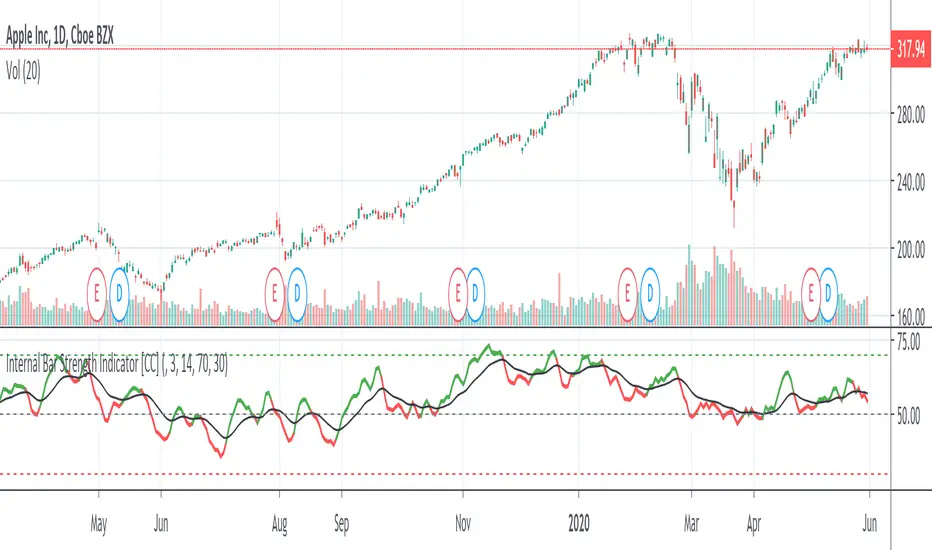 The Internal Bar Strength Indicator is pretty basic but very intuitive. Most stocks that close near their high of the day tend to fall the next day and stocks that close near their low tend to rise the next day. This indicator has very similar buy and sell signals as the RSI. Buy when the indicator rises above its signal or if the indicator is in the red zone and rises up outside of the red zone. Sell when the indicator falls below its signal or if the indicator is in the green zone and falls down outside of the green zone.