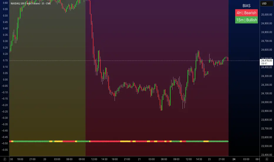 Second line: current chart timeframe bias (e.g., 15m | Bearish) using the same rules and LTF bias color.
