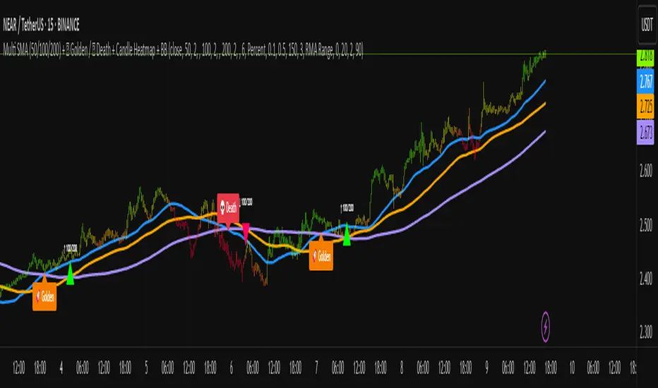 **Multi SMA (50/100/200) + Golden/Death + Candle Heatmap + BB**