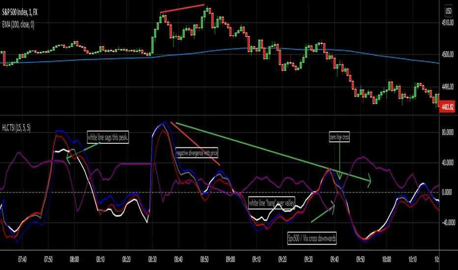 This indicator is a True Strength Indicator with Close, High and Low used together, along with the TSI of the Vix.