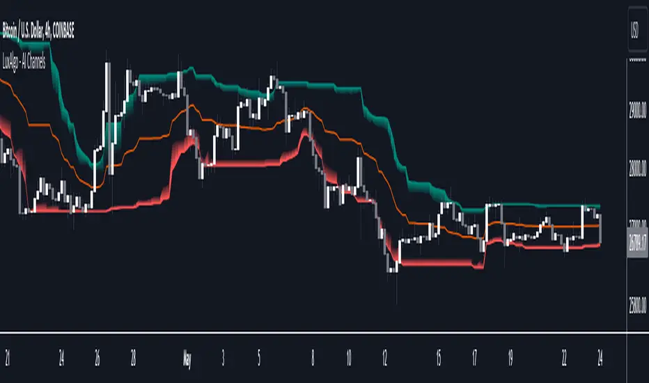 The AI Channels indicator is constructed based on rolling K-means clustering, a common machine learning method used for clustering analysis. These channels allow users to determine the direction of the underlying trends in the price.