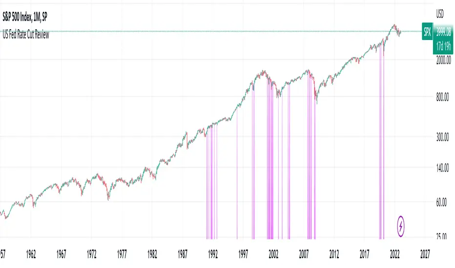 The script applies Purple (color can be changed) highlights to the days that the US Federal Reserve Cut interest rates. Data goes back to the 60's. This can be applied to any chart/timeframe to view how the asset behaved before/during/after Federal Rate cuts.