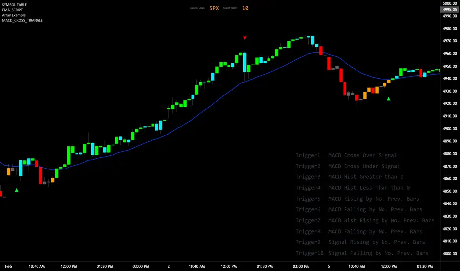 Trigger 1 to 10: Each trigger corresponds to a specific condition involving the MACD line, signal line, and histogram. These include crossovers, directional changes compared to previous bars, and comparisons of current values to historical values.
