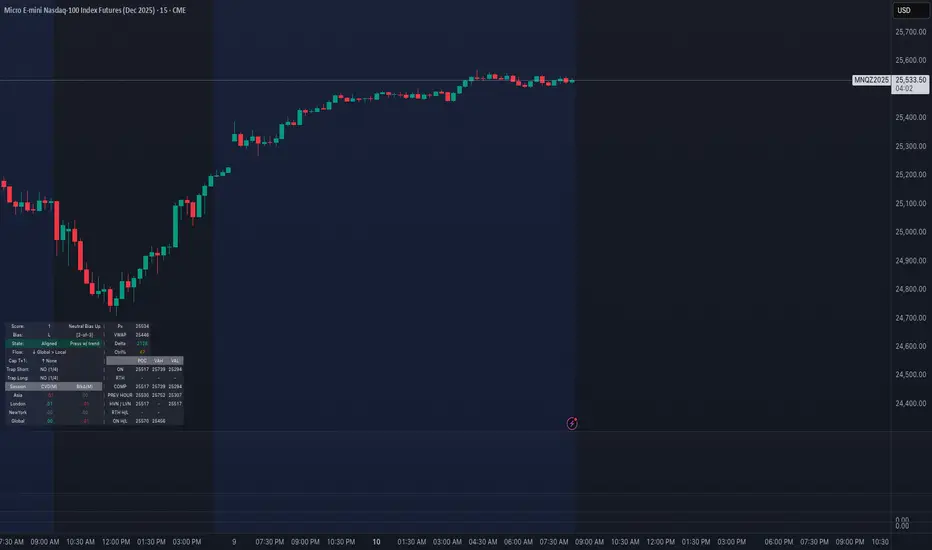 A high-performance multi-layer heads-up display (HUD) designed for intraday futures trading (optimized for NQ/ES). It merges market flow, volume delta, session structure, and directional bias models into a single at-a-glance command panel.