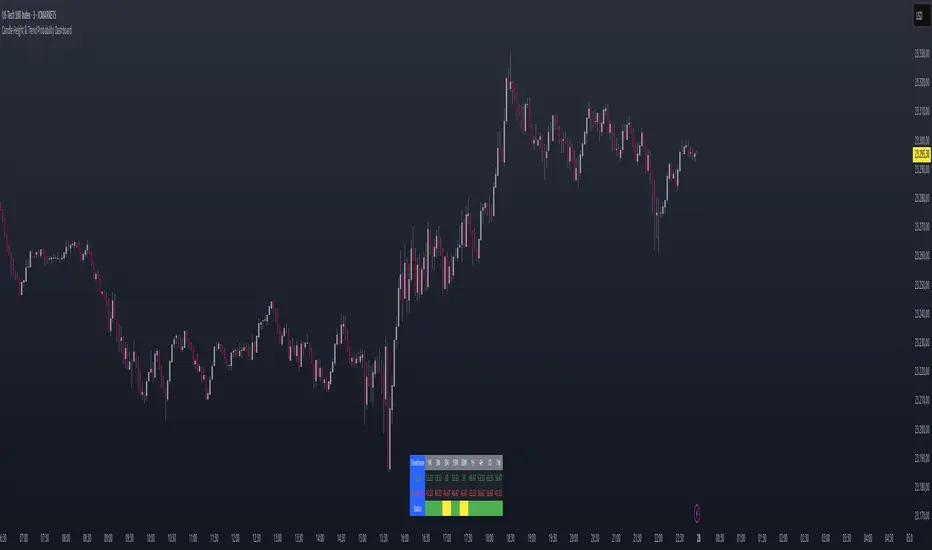 This Pine Script for TradingView displays a dashboard that calculates the probability of price increases or decreases based on past price movements. It analyzes the last 30 candles (by default) and shows the probabilities for different timeframes (from 1 minute to 1 week). Additionally, it checks volatility using the ATR indicator.