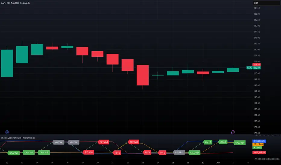 Chaikin Oscillator Multi-Timeframe Bias is an indicator designed to help traders align with institutional buying and selling activity by analyzing Chaikin Oscillator signals across two timeframes—a higher timeframe (HTF) for trend bias and a lower timeframe (LTF) for timing. This dual-confirmation model helps traders avoid false breakouts and trade in sync with market momentum and accumulation or distribution dynamics.