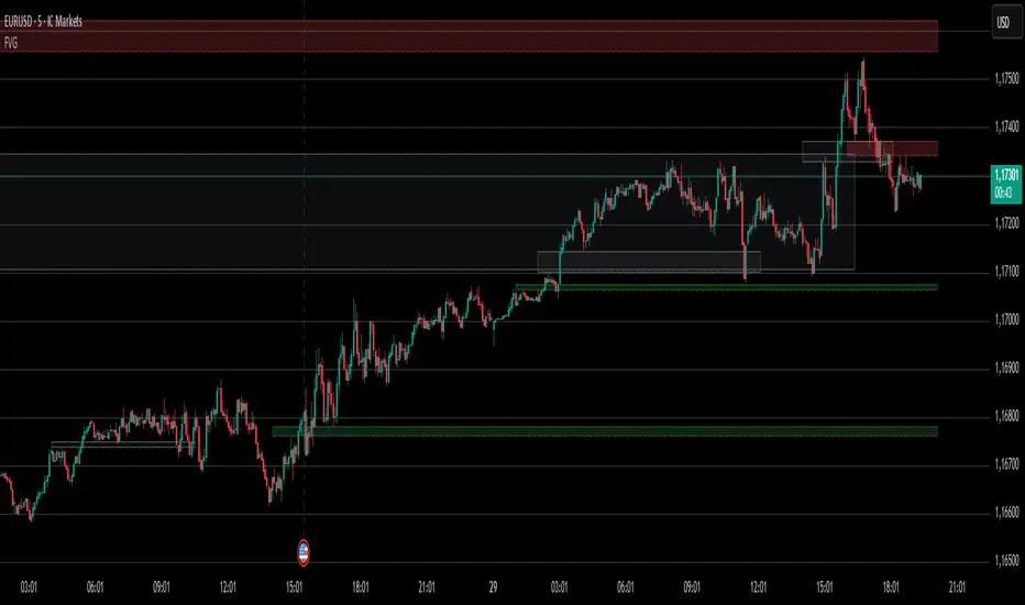 The FVG (Fair Value Gaps) indicator is a sophisticated technical analysis tool designed to identify and display fair value gaps on trading charts across multiple timeframes. Fair value gaps represent price inefficiencies that occur when there's a complete separation between consecutive candles, creating an unfilled price zone. The indicator detects these gaps by analyzing three consecutive candles: it identifies bullish FVGs when a green middle candle creates a gap where the high of the left candle is below the low of the right candle, and bearish FVGs when a red middle candle creates a gap where the low of the left candle is above the high of the right candle.