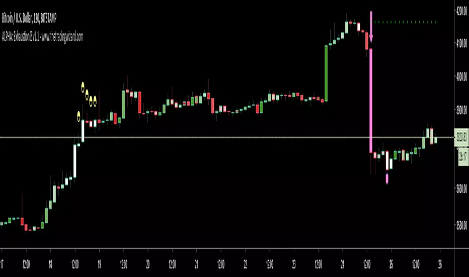 My approach with the ALPHA: Exhaustion is simple, color the candles on a gradient scale based on my exhaustion method for an analyst to easily identify the rate of exhaustion. Additionally, add simple features that help confirm whether a trend has a confirmed beginning and ending. Furthermore I took it a step further and added features that detect weakness in a confirmed trend and give you early indications that the trend may reverse or cancel.