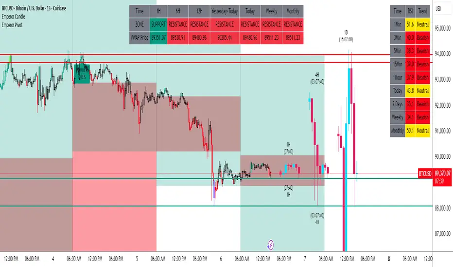 The Emperor RSI Candle includes an RSI box displaying multi-timeframe RSI values from 1 min to monthly. This provides: