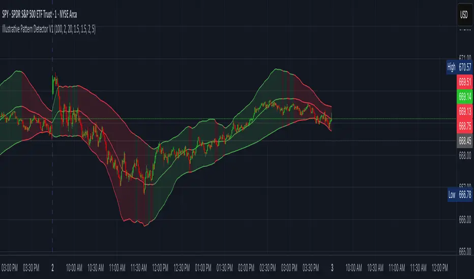 • Regression Channel: The midline uses ta.linreg over a user-selected lookback (default 100 bars). Upper/lower bands are ±(deviation × multiplier) using ta.stdev. Midline/bands can be colored by a simple trend heuristic (pivot highs/lows and recent slope).