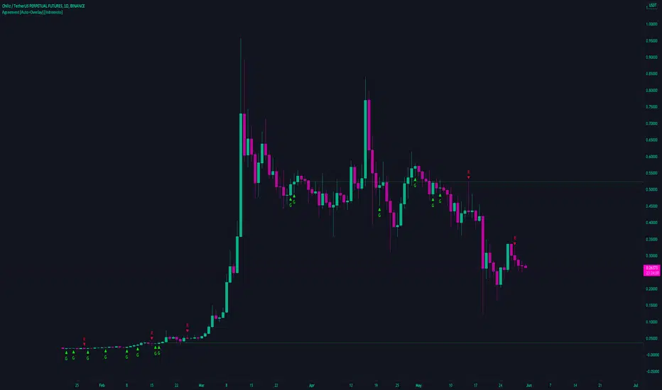 Plotshapes appear when there is a discrepancy on one of the pairings. For example, if the SNXBTC and SNXUSDT chart have green candles, but the SNXUSDTPERP chart has a red candle, you'll see a "R" red plotshape above the current candlestick . The plotshape text, and bias are respective of the perpetuals current color, relative to the other checked charts.