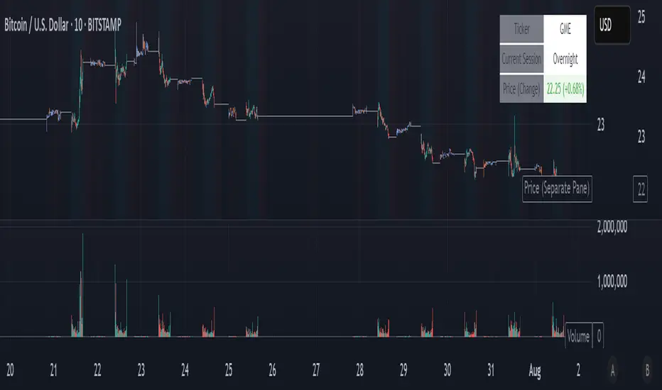 This indicator combines the price of both the regular trading hours and the overnight trading to create a single price line and volume candles. You can select view settings to either overlay the price on the chart, or have it below the chart. Volume can be toggled on or off as well.