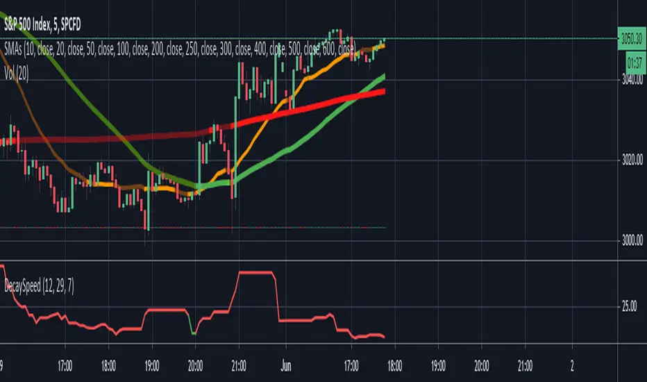 2) speed of options value decay in form of combination of theta decay and option delta. Formulas are approximation of Black-Scholes model as Pine script doesnt allow for advanced functions. Approximations are accurate to 2 decimal points from market open to one hour before market close and will not indicate green when accuracy is not sufficient. Its value is also expressed in [stock move per 5 minutes] so its mutualy comparable.