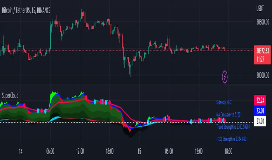 Supercloud is plotted based on the difference of the price movement between various MA's of different length. All MA's are plotted with reference to EMA 200. So when the MA's converge or Diverge or Bounce back we can still be in the Trend unless the Cloud goes below or above Zero Line.