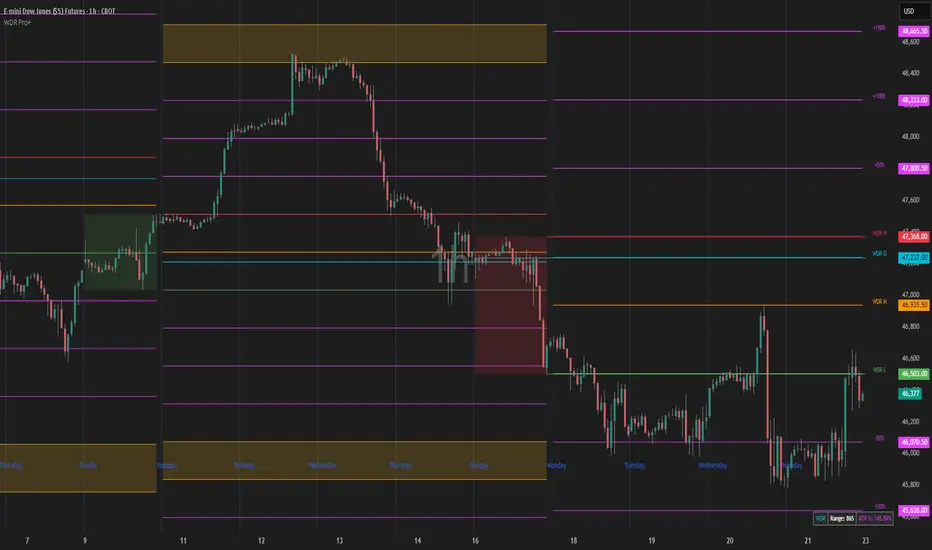 The Weekly Dealing Range indicator identifies range + volatility based pivot levels that form at the close of the first trading session and extend for the entire week. This tool provides key reference points for both trending and range-bound market conditions.