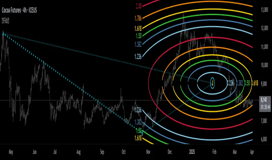 🟩 The Fibonacci Circle Zones indicator is a technical visualization tool, building upon the concept of traditional Fibonacci circles. It provides configurable options for analyzing geometric relationships between price and time, used to identify potential support and resistance zones derived from circle-based projections. The indicator constructs these Fibonacci circles based on two user-selected anchor points (Point A and Point B), which define the foundational price range and time duration for the geometric analysis.
