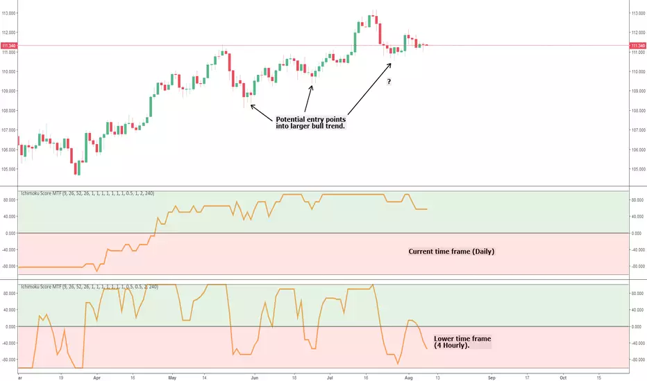 I'm a big fan of MTF analysis when using indicators (particularly oscillators). Using a higher time frame runs into the issue of the indicator repainting until the relevant higher time frame candle closes (this is inevitable and logical - so don't comment saying it repaints!). However, for lagging indicators such as this one, adding a lower time frame provides potential entry and exit signals into the larger trend, and also provides early warning of large trend shifts before the current time frame will. This can give you more control over your trades, and in my experience helps lagging indicators such as Ichimoku stay relevant in high volatility markets that are vastly different from when the indicators were conceived.