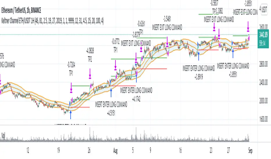 First of all the assets need to be in an upward trend, this will occur when the EMA will cross SMA. The next condition for the entry is the opening and the closure of the candle. The open price of the candle should be in the upper part of the Keltner Channel and the close price should be above the Keltner channel. The third condition for the DM indicator is to be above a certain benchmakr. This benchmark can be set in the settings of the strategy.