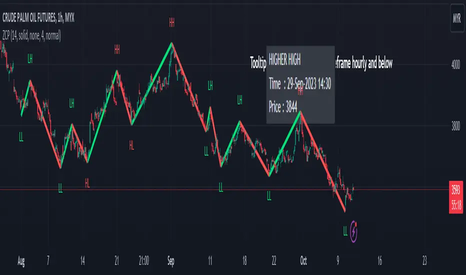 This indicator displays zigzag based on high and low using latest pine script version 5, chart.point which using time, index and price as parameters.