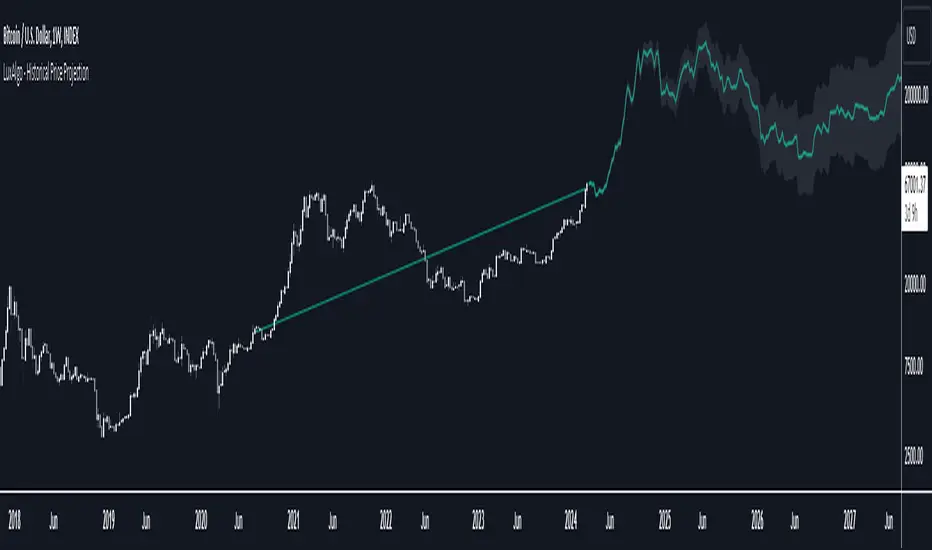 The main feature of this tool is to plot a future price forecast with a surrounding area that exactly matches the price behavior of the selected period, with or without added drift.