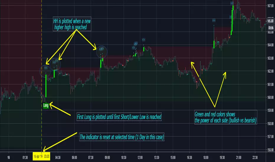 A simple but very useful indicator that plots higher highs and lowers lows and that can be reset each hour, day, week or month, so it can plot new HH and new LL only in that range.